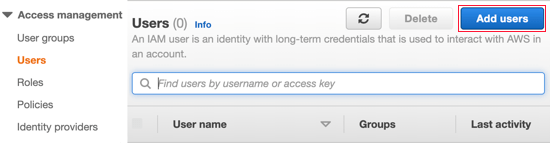 为此,您需要打开Amazon Web Services用户页面。在此页面中,您需要单击“Add users”按钮。