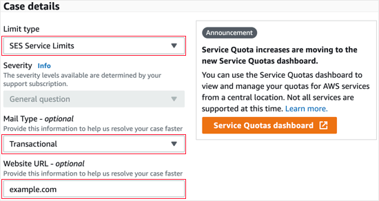 您应该将限制类型保留为“SES Service Limits”并选择“Transactional”作为邮件类型。在Website URL字段中,您应该输入您网站的地址。