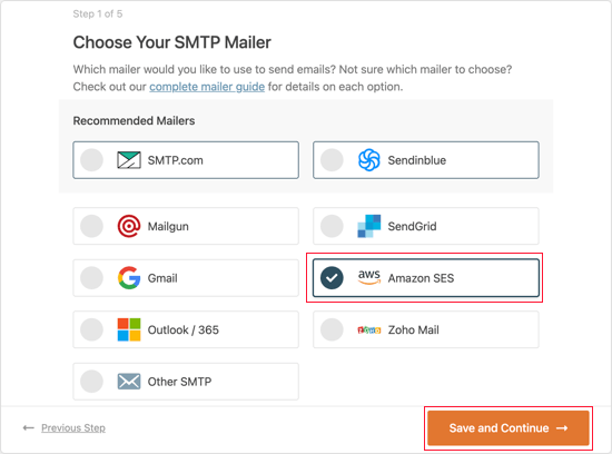接下来,您将看到支持的电子邮件服务列表。在这里,您需要选择Amazon SES,然后单击“Save and Continue”按钮。