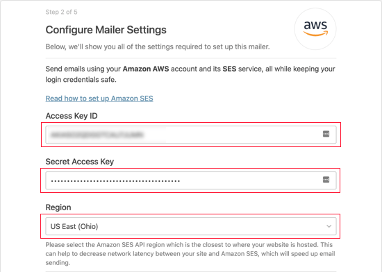 之后,系统会要求您配置邮件程序设置。您需要使用您之前在创建Amazon AWS账户时复制的信息填写Access Key ID,Secret Access Key和区域字段。