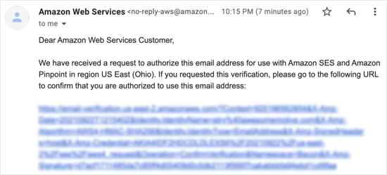 这封电子邮件将从亚马逊网络服务发送,并包含一个验证链接。您必须在24小时内单击此链接以验证此电子邮件地址。