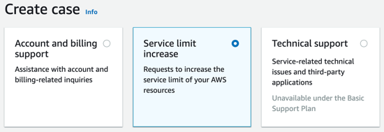 首先,您需要以刚刚设置的用户身份登录。进入“Create case”页面后,您需要单击第二个选项“Service limit increase”。