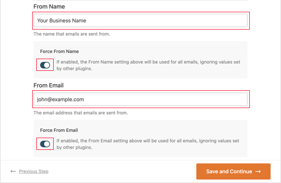 我们建议您选中标有“Force From Email”的框。这意味着您将在WordPress网站上自动使用相同的外发电子邮件地址。