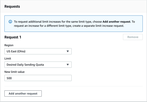对于限制字段,您应该从下拉菜单中选择“Desired Daily Sending Quota”。之后,在“New limit value”下,您应该输入您预计一天内发送的最大电子邮件数量的估计值。
