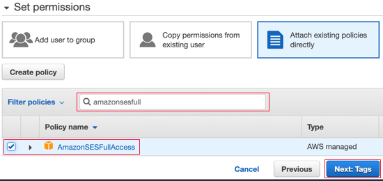 然后您应该在搜索栏中键入“AmazonSESFullAccess”以过滤列表。现在只应列出一项政策。确保勾选该策略左侧的复选框。