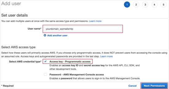 接下来,您需要设置一个新用户。在User name字段中,您可以添加任何您喜欢的名称,但我们建议您使用yourdomain_wpmailsmtp格式。