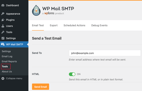 您需要导航到WP Mail SMTP » Tools ,然后单击“Email Test”选项卡。默认情况下,测试电子邮件将发送到您网站的管理员电子邮件地址,但您可以更改此设置。接下来,单击“Send Email”。