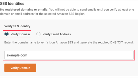 要在Amazon SES上验证您的域名,您需要确保选择了验证域选项。之后,您应该输入您在注册Amazon AWS时使用的域名。