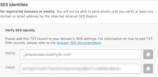 输入域名后,您需要单击“Verify Domain”按钮。您将获得一个名称和值,以添加到您域的DNS设置中的新TXT记录。