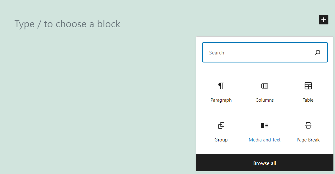 在媒体和文本区块,您可以添加书面内容,视频和图像文件通过使用多个布局并排。要使用它,请打开您要编辑的文章或页面。单击加号并选择媒体和文本 选项: