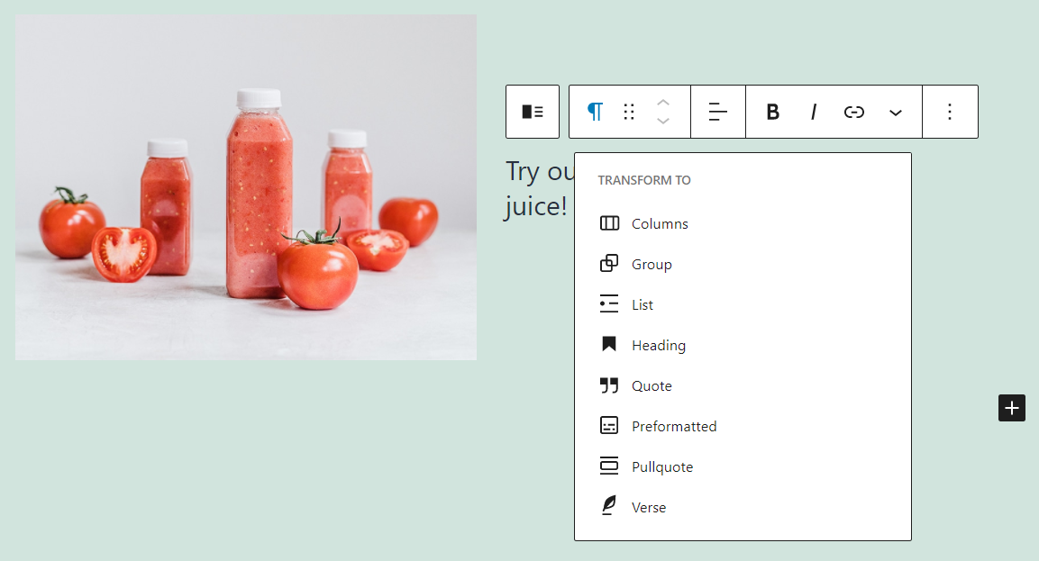请注意,区块的每个部分都有单独的格式菜单。默认情况下,WordPress会在您的媒体文件旁边放置一个段落元素。但是,您可以将其替换为其他基于文本的元素: