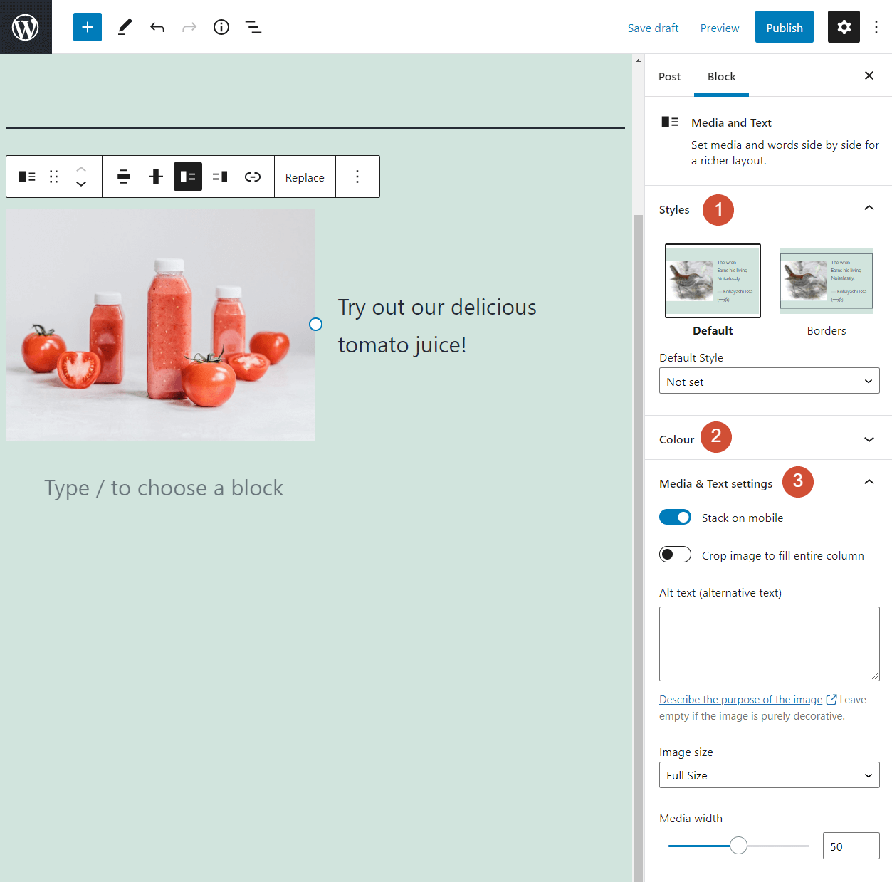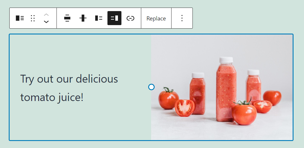 由于这是一个如此简单的区块,我们唯一的建议是格式化元素的写入部分以与您选择的媒体文件完美匹配。例如,您可能不想在单个单词的段落或小列表旁边放一张大照片。您会希望这两个元素看起来平衡。请记住,您可以在区块内调整图像大小。