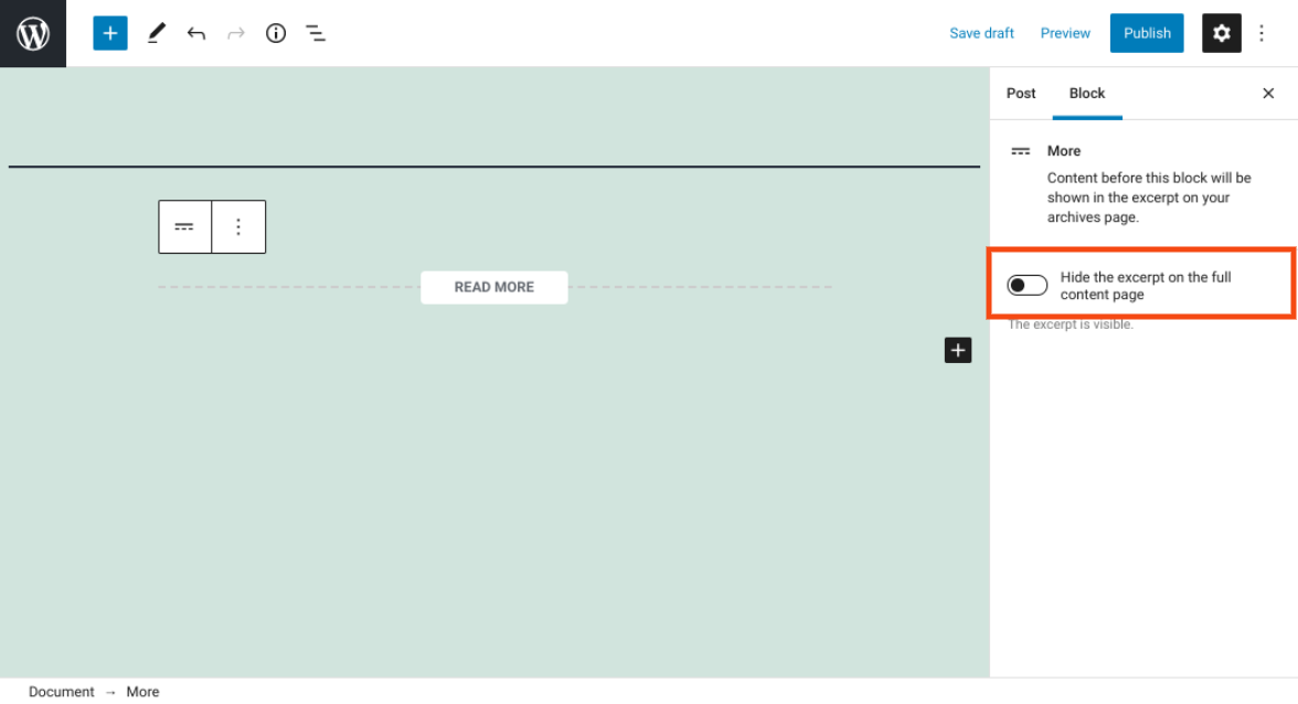 此外,请务必注意,您需要在希望读者看到的摘要文本之后插入此区块。例如,也许您想在第一段之后切断文章。如果是这种情况,您可以在第一段和第二段之间插入此区块。