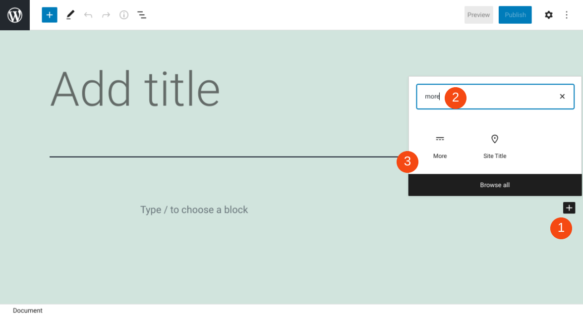 为此,请单击“添加区块”图标 (1),在搜索字段 (2) 中键入“更多”,然后选择第一个选项 (3):