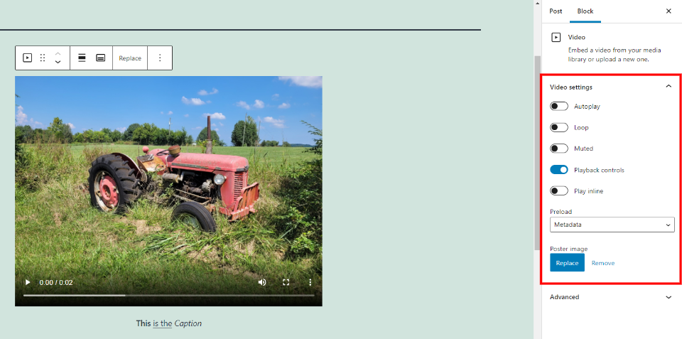 视频区块的设置包括视频和高级。让我们看看两者。