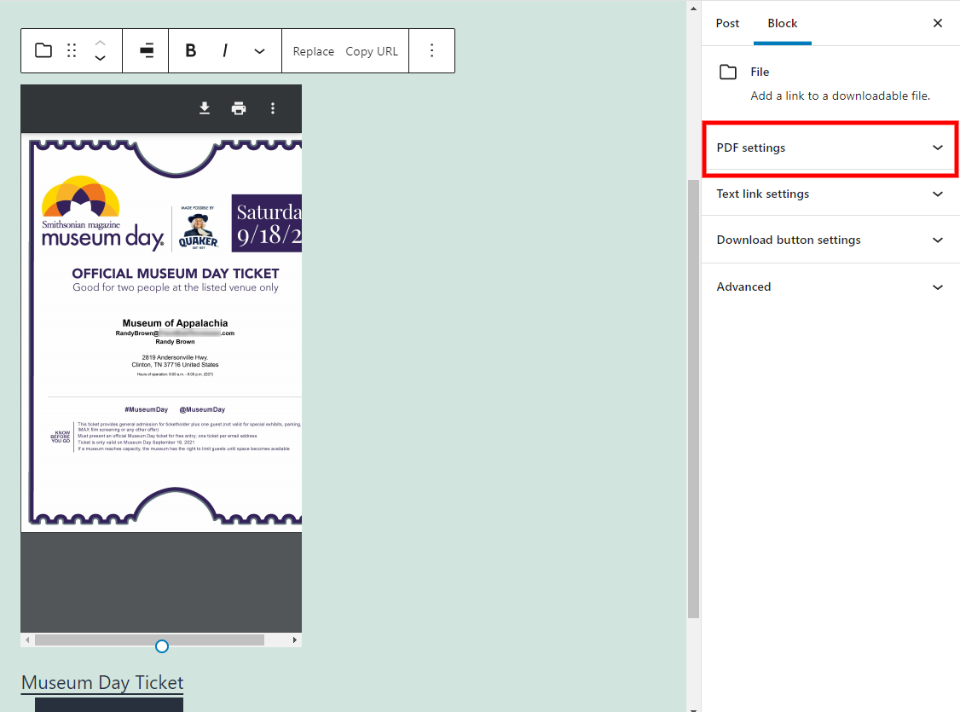 侧边栏设置包括文本链接、下载按钮设置和高级。通过单击右上角的齿轮打开或关闭侧边栏。单击块会将侧栏更改为“文件区块”选项。