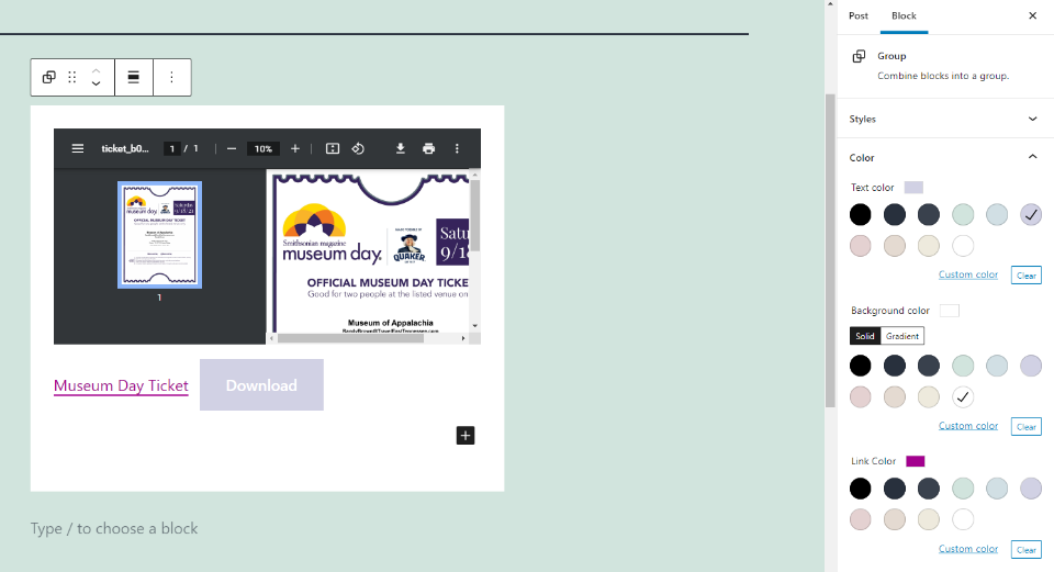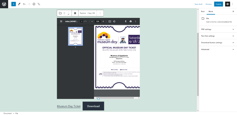 这就是我们对WordPress文件区块的看法。这是一个简单的区块,可让您提供多种文件类型并包含链接的文本和按钮选项。两者都可以独立设计。如果文件是PDF并且它是可调整的,我喜欢它添加预览。此块非常适合从您的网站提供可下载文件的链接。