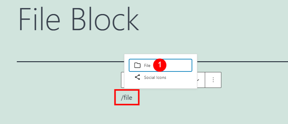 要添加文件区块,首先,单击要放置区块的位置或编辑器左上角的区块插入器工具。接下来,搜索“文件”并选择它。