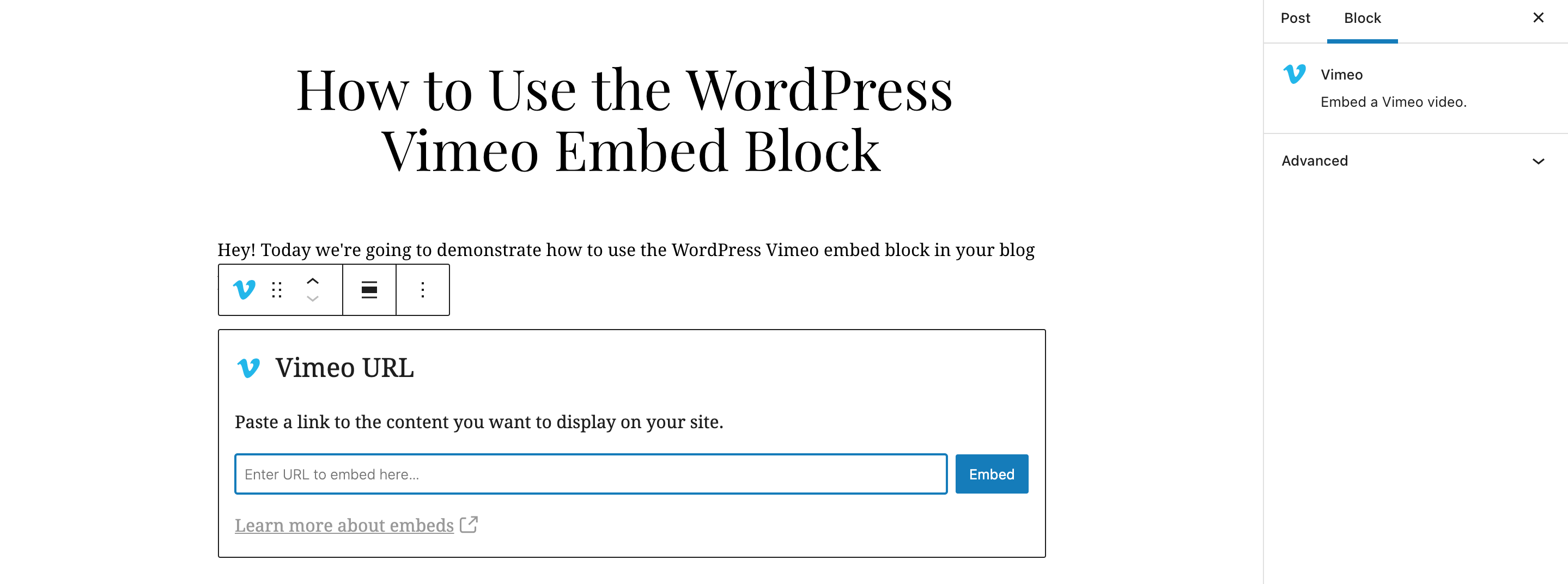 让我们来看看使用区块编辑器让Vimeo视频显示在您的WordPress网站上所需采取的确切步骤。