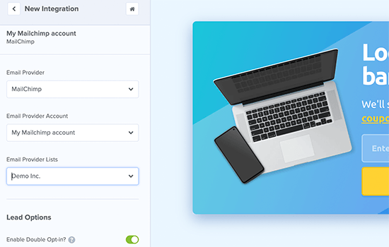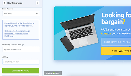 在OptinMonster构建器中输入您的API密钥后,单击“Connect to Mailchimp”按钮。接下来,您需要选择您的Mailchimp帐户和您的电子邮件列表。