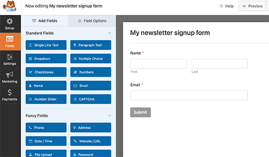 这将启动表单构建器,其中包含您的电子邮件列表注册表单的所有必填字段。您只需单击它们即可编辑或删除表单中的字段。