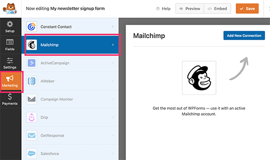 对表单感到满意后,您需要切换到marketing选项卡并单击Mailchimp部分。从这里您需要单击添加新连接按钮。