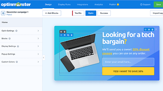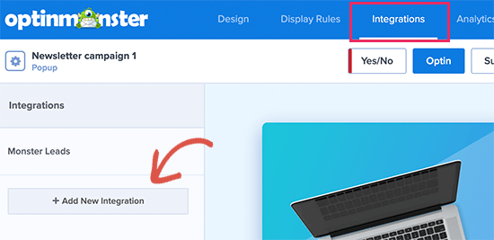 OptinMonster具有直观的拖放界面,您只需指向并单击即可编辑任何项目。您还可以添加称为区块的新设计元素,以添加您自己的图像、文本、按钮等。一旦您对活动设计感到满意,您需要将其连接到您的Mailchimp帐户。只需切换到集成选项卡,然后单击Add New Integration按钮。