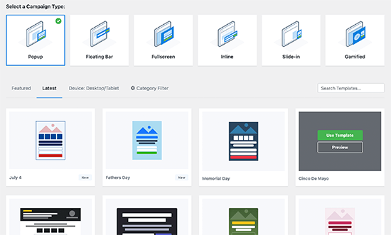 接下来,您需要选择广告系列类型。OptinMonster允许您创建多种类型的活动,包括灯箱弹出窗口、浮动条、内联活动、滑入式、全屏和轮弹游戏出窗口等形式的广告。