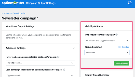 这会将您带到WordPress网站上的广告系列输出页面。从这里您需要选择要在何处显示活动并发布它。
