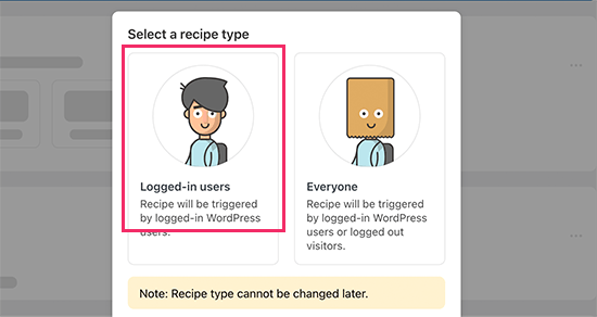 您需要做的第一件事是安装并启用Uncanny Automator插件。启用插件后,您需要访问Automator » Add New页面以创建您的第一个方案。系统会要求您选择要创建的方案类型。就本教程而言,每当我们发布新文章时,我们都会向订阅者发送一封自动电子邮件。首先,选择logged-in users。