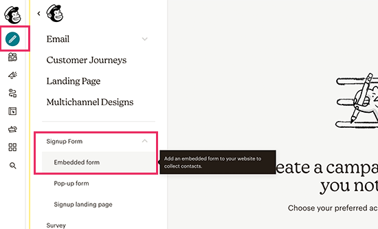 Mailchimp带有内置订阅表格,您可以将其嵌入您的WordPress网站。只需单击左侧工具栏中的创建按钮,然后选择Signup Form » Embedded Form选项。