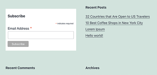 不要忘记单击“Update”按钮以保存您的小工具设置。您现在可以访问您的网站以查看您的Mailchimp注册表单。