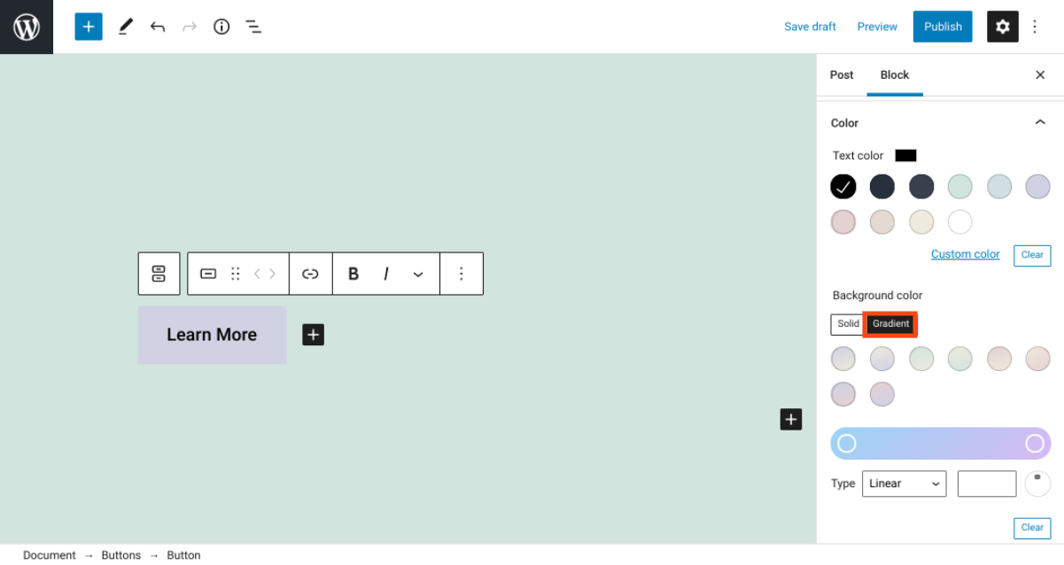 您还可以通过在文本编辑器中键入“/buttons”并按键盘上的Enter键来添加按钮区块。插入区块后,您将可以访问一个新的工具栏菜单,我们将在下面讨论。