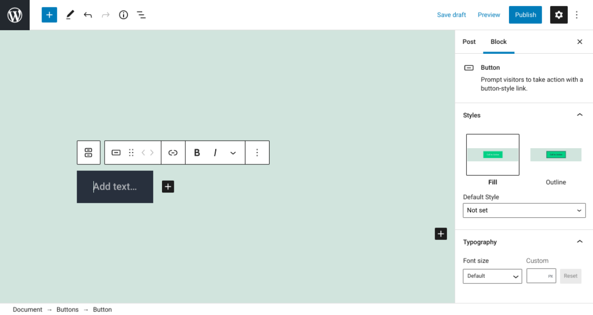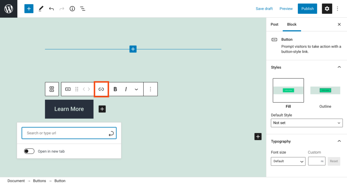 每个WordPress区块都有自己的一组控件和配置选项。添加按钮时,有很多选项可用于链接、对齐和设置它们的样式。我们将从探索文本和链接设置开始。