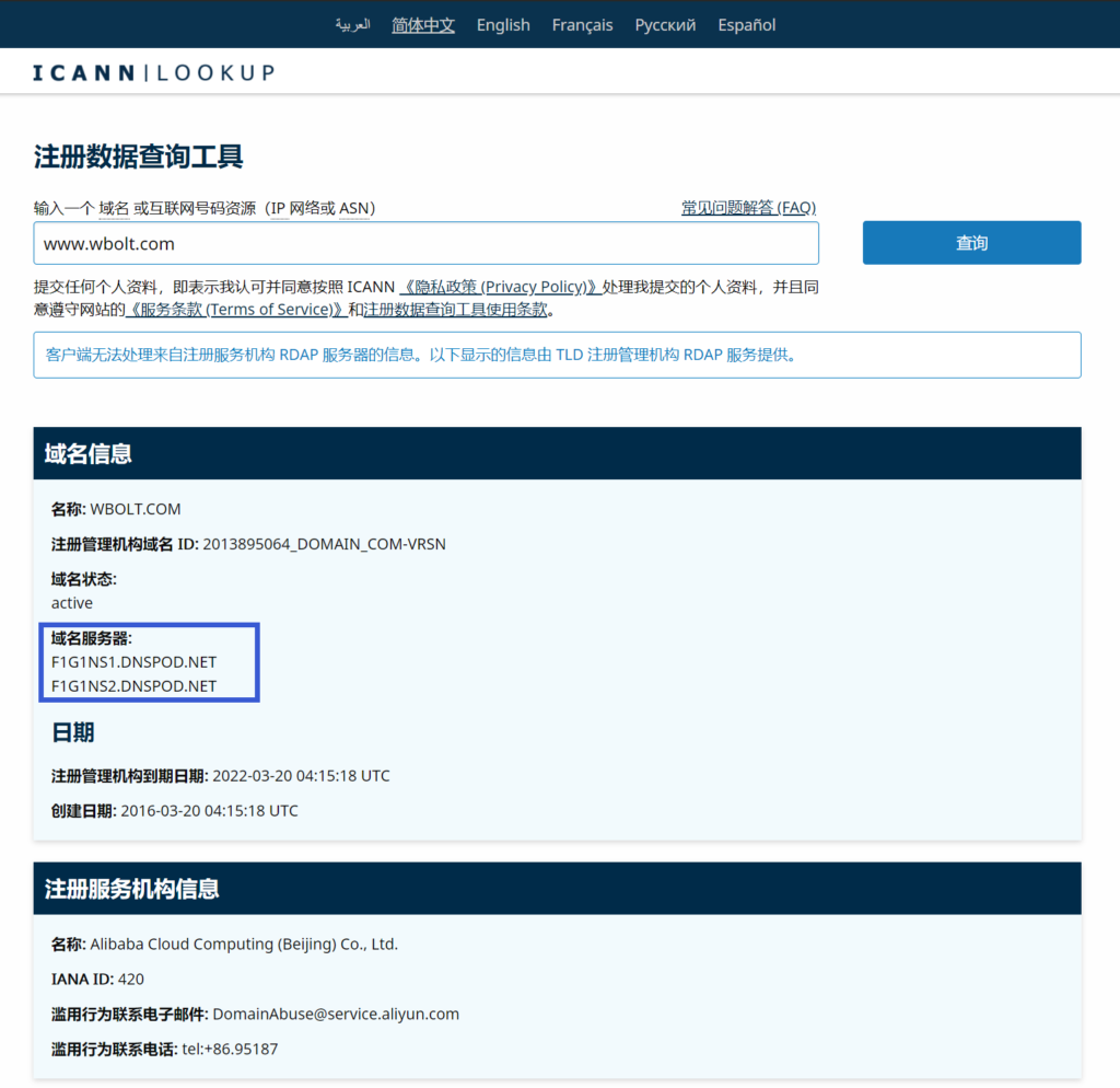如果您愿意,您可以轻松查看当前使用的名称服务器。解决此问题的一种方法是使用官方互联网名称与数字地址分配机构 (ICANN) 查找工具: