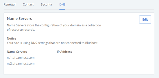现在,您将在Bluehost中看到您的域的DNS详细信息。继续并单击这些旁边的“Edit”按钮。