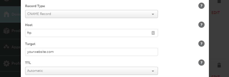 如果您想使用ftp.yourwebsite.com等域通过FTP访问您的网站,则需要设置相应的FTP服务的CNAME记录: