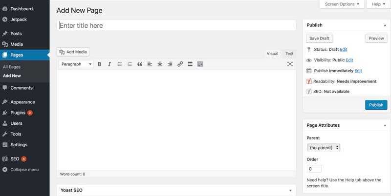在此框中,父页下有一个下拉菜单。如果您想让此页面成为其他页面之一的子页面或子页面,您可以在此处执行此操作。否则,您可以简单地使用“顺序”框来确定您的页面在网站菜单上的显示顺序。例如,如果您将数字保留为0,则所选页面将是层次结构中的第一个页面。如果所有页面都设置为0,它们将按字母顺序组织。
