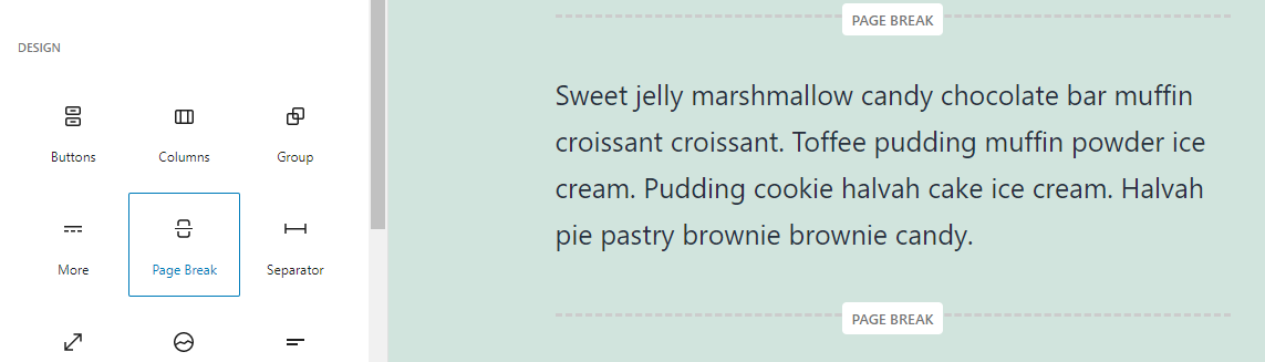 准备好要分割的内容后,单击加号图标以添加新区块。在“设计” 选项卡下 查找“分页符”选项并选择它: