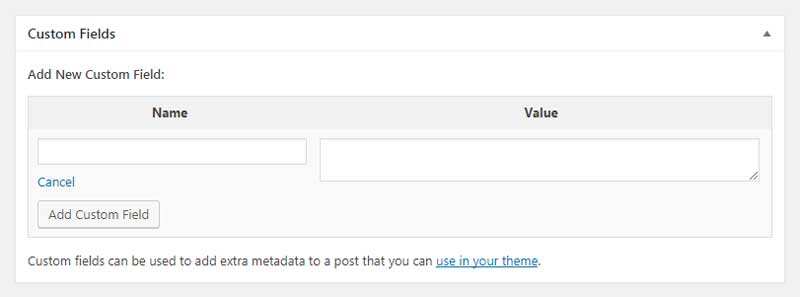在名称和字段值下,您将添加一些元数据来描述要添加到此文章的信息。根据您安装的主题和插件,您可能已经在名称下列出了一些选项。无论如何,您将希望在此实例中创建新的元数据。