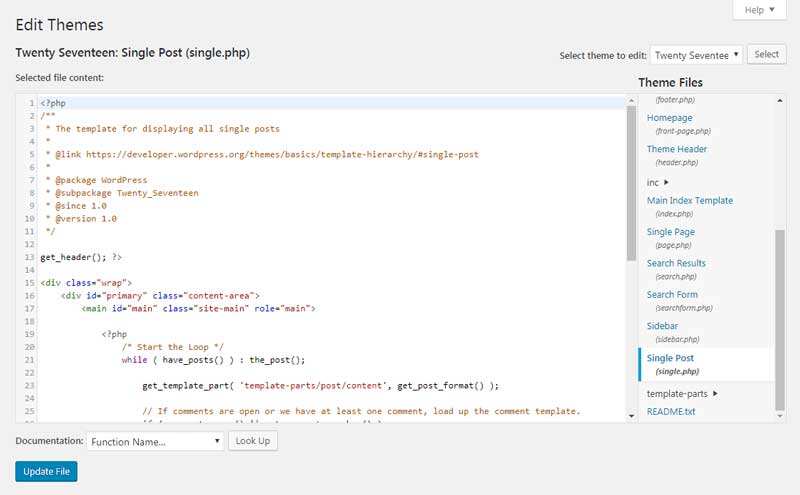 在WordPress中,您需要导航到外观>主题编辑器。在这里,您可以浏览并更改构成您网站的文件。您需要查看右侧的侧边栏并找到Single Post文件(也称为single.php)。