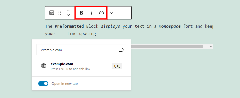 粗体、斜体和链接设置控制单击按钮时突出显示的文本。您可以单独或一起使用它们。您可以通过在链接弹出窗口底部启用链接来在新选项卡中打开链接。