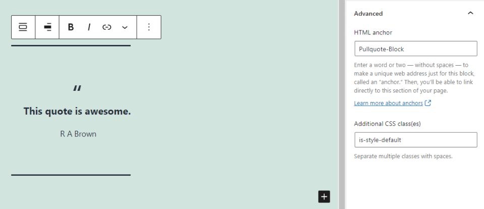 高级设置包括HTML锚点和附加CSS类。锚点提供了一个URL,因此您可以直接链接到该区块。CSS类字段包括您选择的样式,您可以根据需要添加其他类。