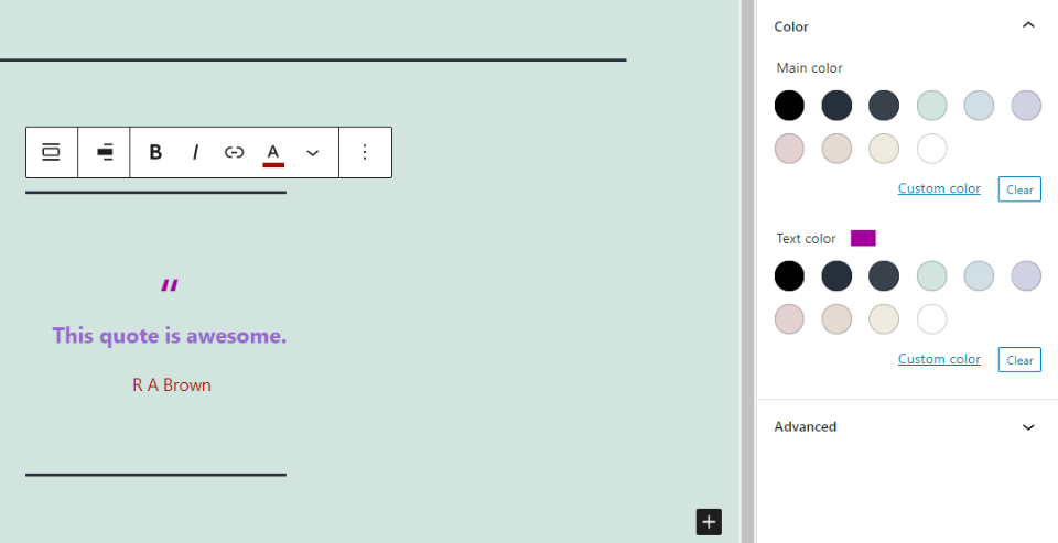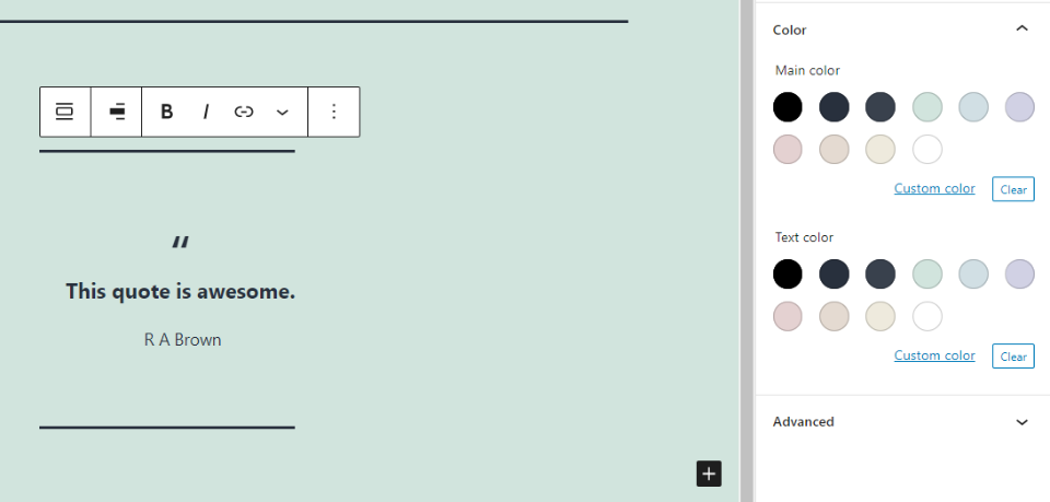 侧边栏设置包括样式、颜色和高级。单击右上角的齿轮以打开或关闭侧边栏。单击该块会将侧栏更改为引文区块选项。