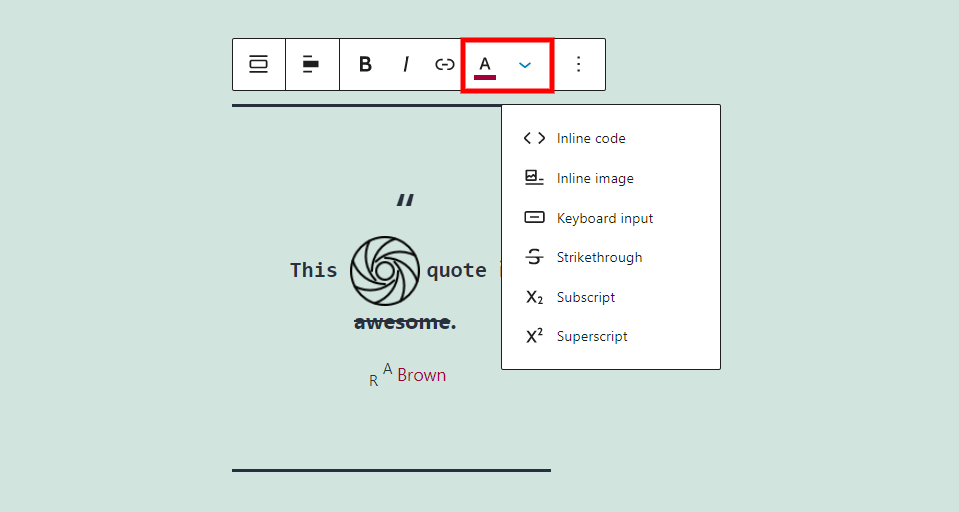 - 文本颜色– 允许您更改文本的颜色,例如上面引文中的单词Brown。当工具栏处于活动状态时,设置图标会更改为工具栏。