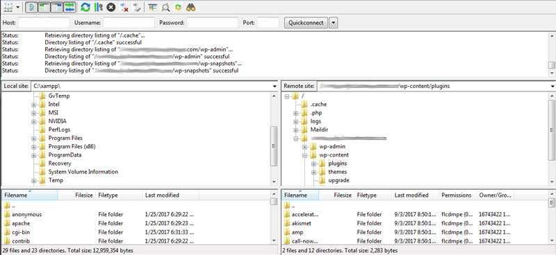 这是您需要为新插件放置文件的地方。首先解压缩它们,然后将它们复制并粘贴到插件文件夹中。或者,您可以使用FileZilla的两个左侧象限在计算机上找到文件,然后将它们拖过来(再次,在它们被解压缩后)。