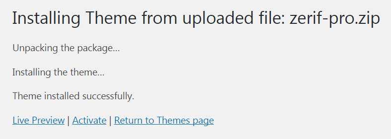 WordPress将花一些时间安装主题。然后,您将获得一些后续选项。