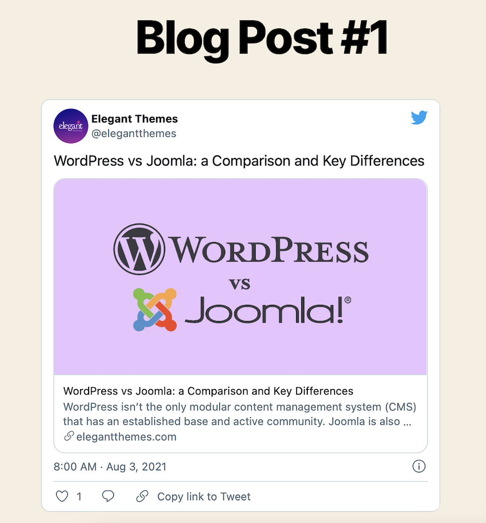 在您的WordPress内容中嵌入您自己的推文是鼓励交叉推广的好方法。例如,如果您正在举办Twitter竞赛,嵌入的推文将很容易将博客阅读引导至他们可以参与的平台。您可以根据文章或页面上的主题嵌入不同的推文,或者如果您有特别吸引人或相关的推文,则可以在所有内容中嵌入相同的推文。