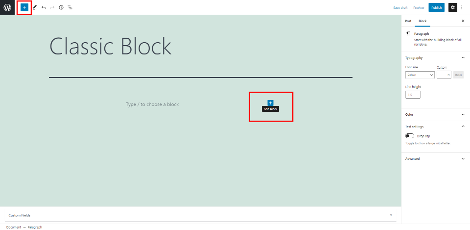 经典区块以与任何块相同的方式添加到文章和页面中。单击左上角或要放置区块的位置的区块插入器图标。