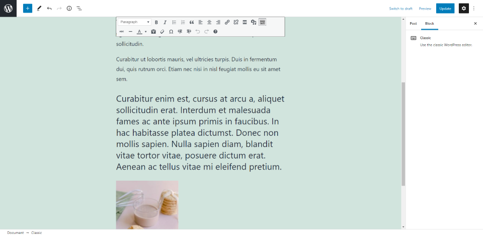 如果您希望在一个位置查看所有样式工具,请使用经典区块。滚动时工具栏会保持原位,因此所有选项都在视图中。单击区块中的任意位置以显示工具栏。